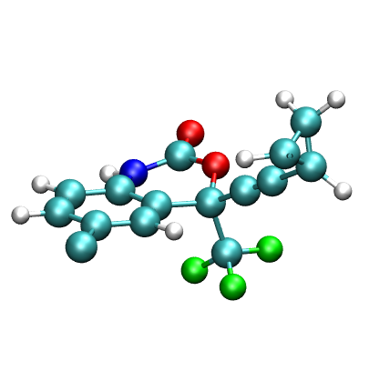 In this tutorial we shall use the Antechamber tools with Leap to create topology and coordinate files for the prescription drug Sustiva (Efavirenz). Sustiva (http://www.sustiva.com) is a human immunodeficiency virus type 1 (HIV-1) specific, non-nucleoside, reverse transcriptase inhibitor marketed by Bristol Myers Squibb for controlling the progression of HIV infection in humans. The chemical name for Sustiva is (S)-6-chloro-(cyclopropylethynyl)-1,4-dihydro-4-(trifluoromethyl)-2H-3,1-benzoxazin-2-one. Its empirical formula is C14H9ClF3NO2 and it's 2D structure is: